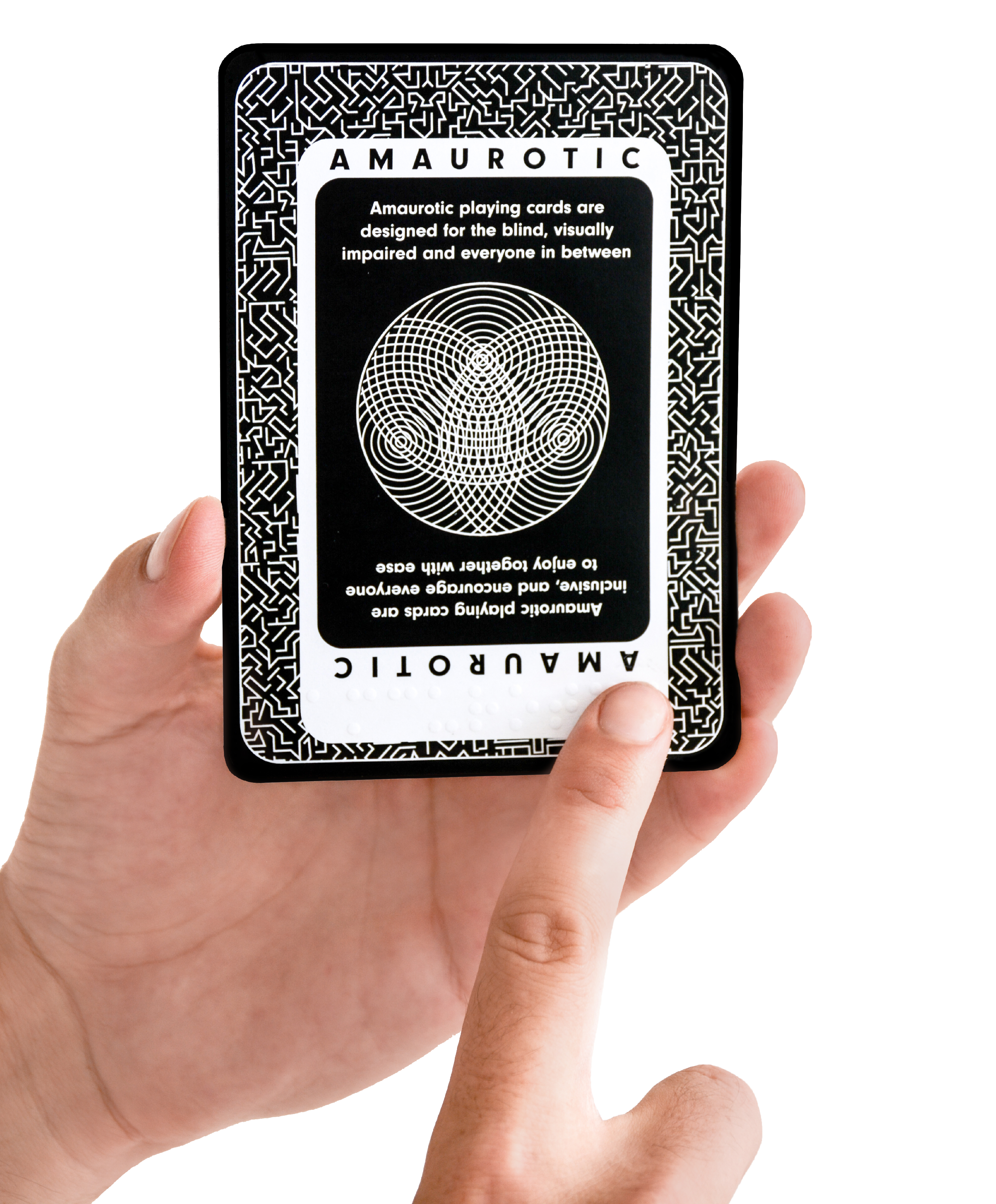 Each Amaurotic playing card has embossed braille in the top and bottom corners. The braille does not show through the card as it is double-layered, therefore people with regular vision as well as the visually impaired or blind, have a fair playing ground. Creating a space for inclusivity and collaboration.